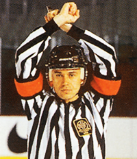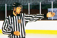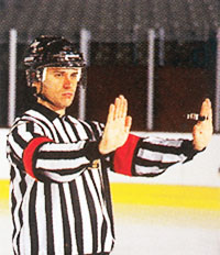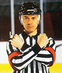 Поднятые обе руки в стороны на уровне плеч с ладонями, повернутыми вниз: - Рефери, показывающим знак «гол не засчитан», «паса рукой не было», «не было игры по шайбе высоко поднятой клюшкой». - Боковым судьей, показывающим знак «проброса нет» и в определенных ситуациях – «положения вне игры нет».