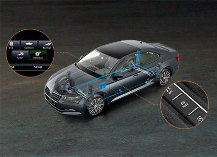 Новая версия ŠKODA Superb Combi — первая модель компании ŠKODA, которая оснащена адаптивной системой регулирования ходовой части (DCC), в том числе переключателем режимов вождения (Driving Mode Select). С помощью системы DCC водитель может корректировать управление автомобилем в соответствии с собственными предпочтениями. На выбор предлагаются режимы Normal, Sport или Comfort, а сам процесс настройки ходовой части напоминает выбор блюда в ресторанах «à la carte».