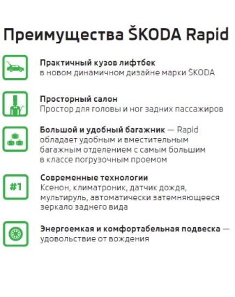 Лифтбэк ŠKODA Rapid – безусловный фаворит ŠKODA на российском автомобильном рынке, и наибольшие изменения коснулись именно его. Rapid оснащён новыми атмосферными двигателями 1.6 MPI серии EA 211 с увеличенной мощностью 90 л.с. (5,8 л/100 км) и 110 л.с. (5,9 л/100 км), а также агрегатом 1.4 TSI мощностью 125 л.с. (4,8 л/100 км). Атмосферные двигатели сочетаются с 5-ступенчатой механической и 6-ступенчатой автоматической коробками передач. Версия 1.4 TSI идет в паре с DSG-7.