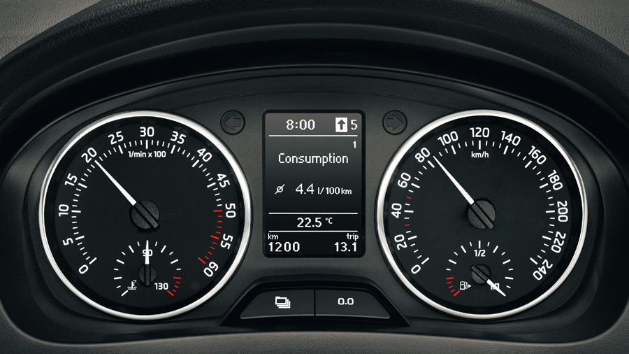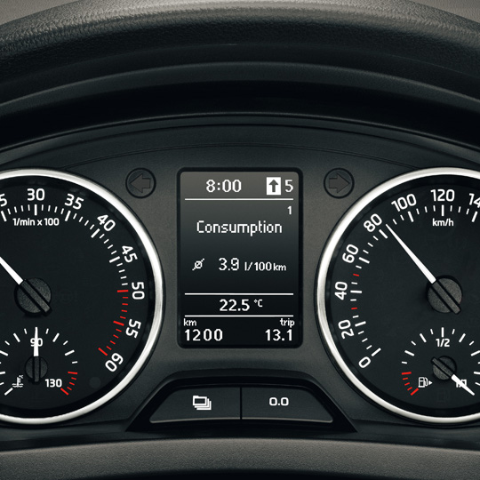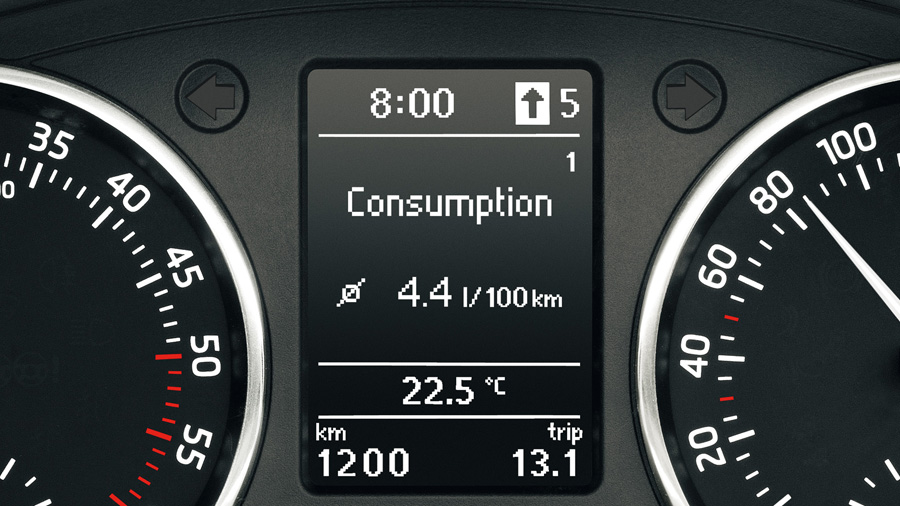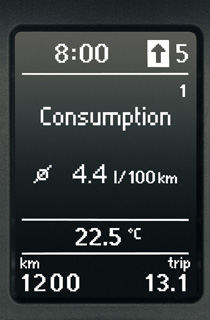 Дисплей бортового компьютераНа центральном многофункциональном дисплее (MFD) отображаются различные данные бортового компьютера, такие как текущее время, рекомендация переключения передачи, запас хода, показания одометра (суточный и общий пробег), расход топлива и т.д. Дисплей заключен в хромированную декоративную рамку.