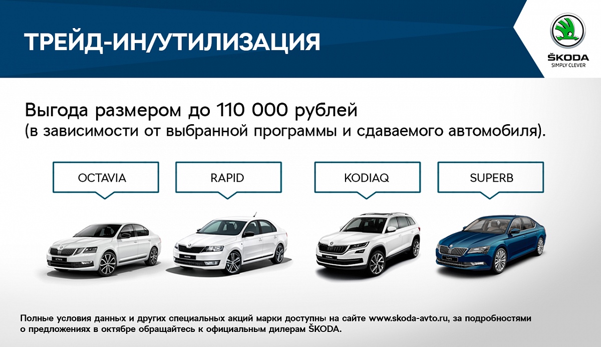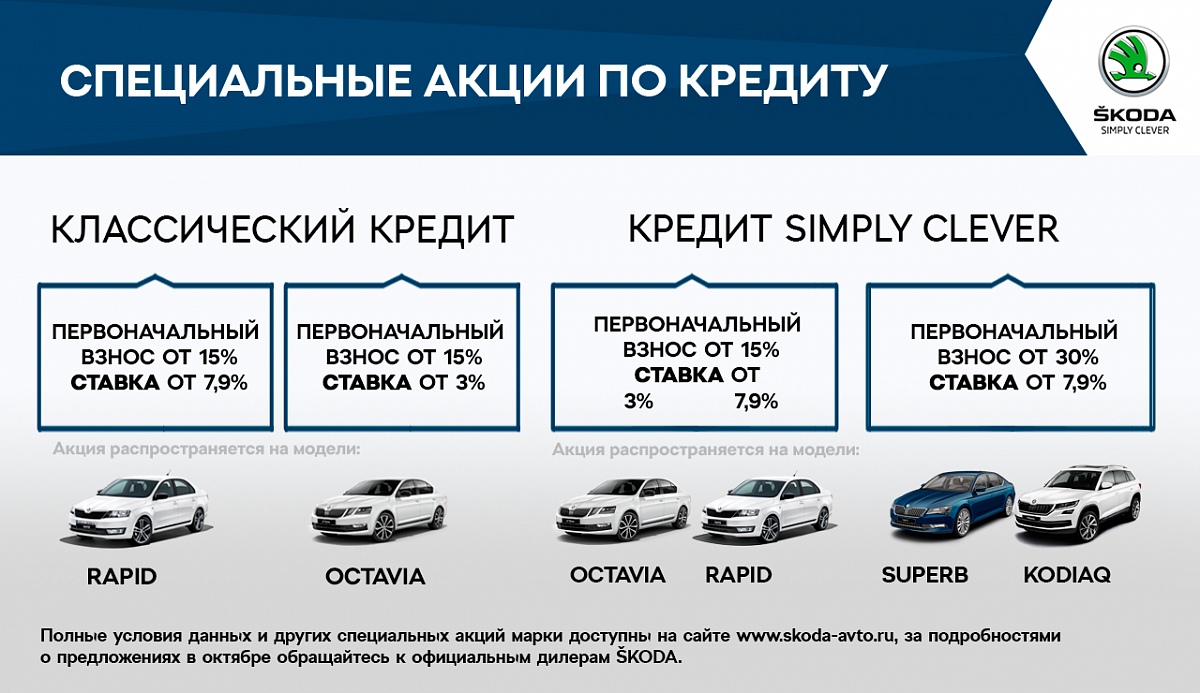 Москва, 02 октября 2018 года — В октябре ŠKODA AUTO Россия подготовила новые предложения на покупку автомобилей чешской марки. Отныне клиенты, выбирающие модель ŠKODA OCTAVIA, могут рассчитывать на кредитную ставку от 3% по классическому кредиту и кредиту SIMPLY CLEVER. Ставка на модели RAPID, KODIAQ и SUPERB также снижена и начинается теперь от 7,9%. Продлевают свое действие и другие выгодные акции.