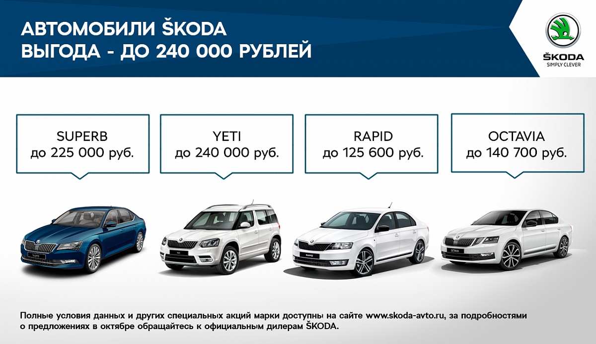 Во второй месяц осени продолжают действовать и другие интересные предложения. Так, выгода в размере до 240 000 рублей доступна при покупке ŠKODA YETI, а при выборе ŠKODA SUPERB — до 225 000 рублей. Приобретение семейного лифтбека ŠKODA OCTAVIA позволяет сэкономить до 140 700 рублей, а будущим владельцам модели ŠKODA RAPID предоставляется выгода до 125 600 рублей.